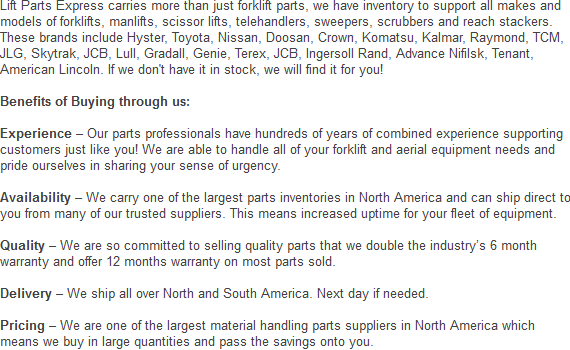 For your entire fleet of forklifts, we offer the best deals on all our parts. If you are interested in receiving an estimate for our parts or attachments, give us a phone call today at: